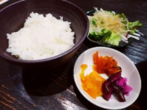 ご飯、サラダ、漬物、味噌汁、玉子スープ、味噌汁などはセルフで食べ放題です!ゆで玉子も一人1つ食べられます。お重のタレもあります!