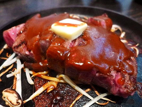 熱々に焼けた鉄板の上に、素晴らしく巨大で肉厚のステーキがど~んと乗って、デミグラスソースがたっぷりかかっています!